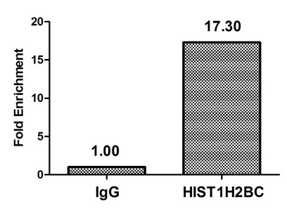 Chromatin Immunoprecipitation Hela (106, treated with 30mM sodium butyrate for 4h) were treated with Micrococcal Nuclease, sonicated, and immunoprecipitated with 5µg anti-HIST1H2BC (CSB-PA010403OA85acHU) or a control normal rabbit IgG. The resulting ChIP DNA was quantified using real-time PCR with primers against the β-Globin promoter.