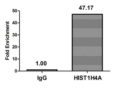 Chromatin Immunoprecipitation Hela (4*106, treated with 30mM sodium butyrate for 4h) were treated with Benzanase, sonicated, and immunoprecipitated with 5µg anti-HIST1H4A (CSB-PA010429OA79acHU) or a control normal rabbit IgG. The resulting ChIP DNA was quantified using real-time PCR with primers against the β-Globin promoter.