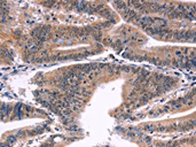 The image on the left is immunohistochemistry of paraffin-embedded Human colon cancer tissue using CSB-PA985124(BAP1 Antibody) at dilution 1/40, on the right is treated with fusion protein. (Original magnification: ×200)