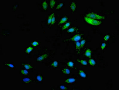 Immunofluorescent analysis of Hela cells using CSB-PA002593LA01HU at dilution of 1:100 and Alexa Fluor 488-congugated AffiniPure Goat Anti-Rabbit IgG(H+L)