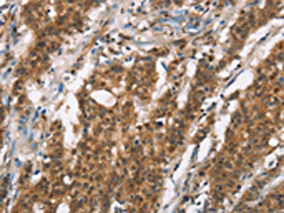 The image on the left is immunohistochemistry of paraffin-embedded Human gastic cancer tissue using CSB-PA697671(BCAS4 Antibody) at dilution 1/50, on the right is treated with synthetic peptide. (Original magnification: ×200)
