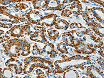 The image on the left is immunohistochemistry of paraffin-embedded Human thyroid cancer tissue using CSB-PA842510(BCAT2 Antibody) at dilution 1/70, on the right is treated with fusion protein. (Original magnification: ×200)