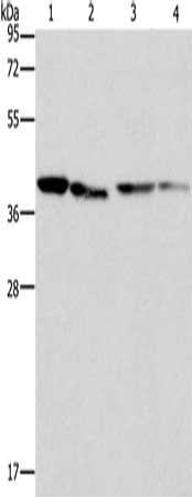 Gel: 12%SDS-PAGE, Lysate: 40 μg, Lane 1-4: Human placenta tissue, NIH/3T3 cells, Raji cells, hepG2 cells, Primary antibody: CSB-PA842510(BCAT2 Antibody) at dilution 1/312.5, Secondary antibody: Goat anti rabbit IgG at 1/8000 dilution, Exposure time: 5 seconds