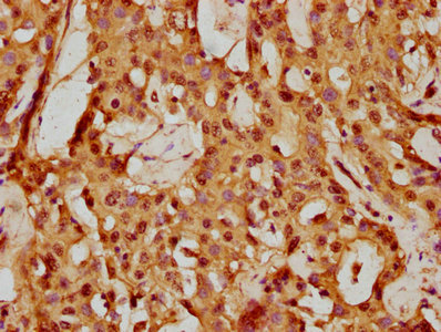 IHC image of CSB-PA884627LA01HU diluted at 1:150 and staining in paraffin-embedded human liver cancer performed on a Leica BondTM system. After dewaxing and hydration, antigen retrieval was mediated by high pressure in a citrate buffer (pH 6.0). Section was blocked with 10% normal goat serum 30min at RT. Then primary antibody (1% BSA) was incubated at 4°C overnight. The primary is detected by a biotinylated secondary antibody and visualized using an HRP conjugated SP system.