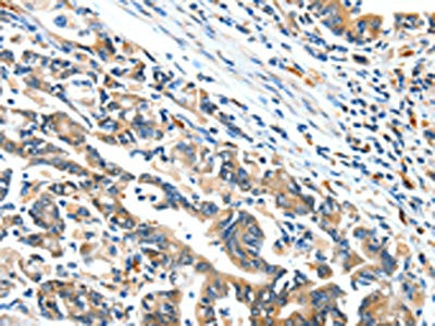 The image on the left is immunohistochemistry of paraffin-embedded Human gastic cancer tissue using CSB-PA596925(BCL2L2 Antibody) at dilution 1/15, on the right is treated with fusion protein. (Original magnification: ×200)