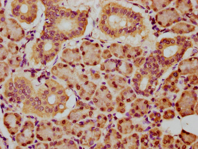 IHC image of CSB-PA755911LA01HU diluted at 1:150 and staining in paraffin-embedded human pancreatic tissue performed on a Leica BondTM system. After dewaxing and hydration, antigen retrieval was mediated by high pressure in a citrate buffer (pH 6.0). Section was blocked with 10% normal goat serum 30min at RT. Then primary antibody (1% BSA) was incubated at 4°C overnight. The primary is detected by a biotinylated secondary antibody and visualized using an HRP conjugated SP system.
