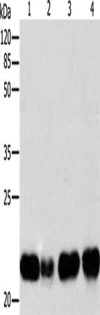 Gel: 12%SDS-PAGE, Lysate: 30 μg, Lane 1-4: Human fetal brain tissue, Human liver tissue, HT29 cells, HepG2 cells, Primary antibody: CSB-PA787438(BID Antibody) at dilution 1/260, Secondary antibody: Goat anti rabbit IgG at 1/8000 dilution, Exposure time: 10 seconds