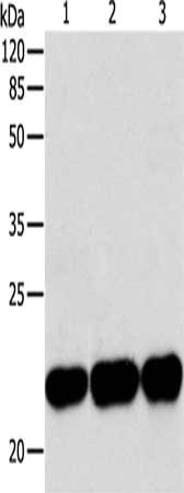 Gel: 12%SDS-PAGE, Lysate: 30 μg, Lane 1-3: Human fetal brain tissue, HT29 cells, HepG2 cells, Primary antibody: CSB-PA225375(BID Antibody) at dilution 1/220, Secondary antibody: Goat anti rabbit IgG at 1/8000 dilution, Exposure time: 10 seconds