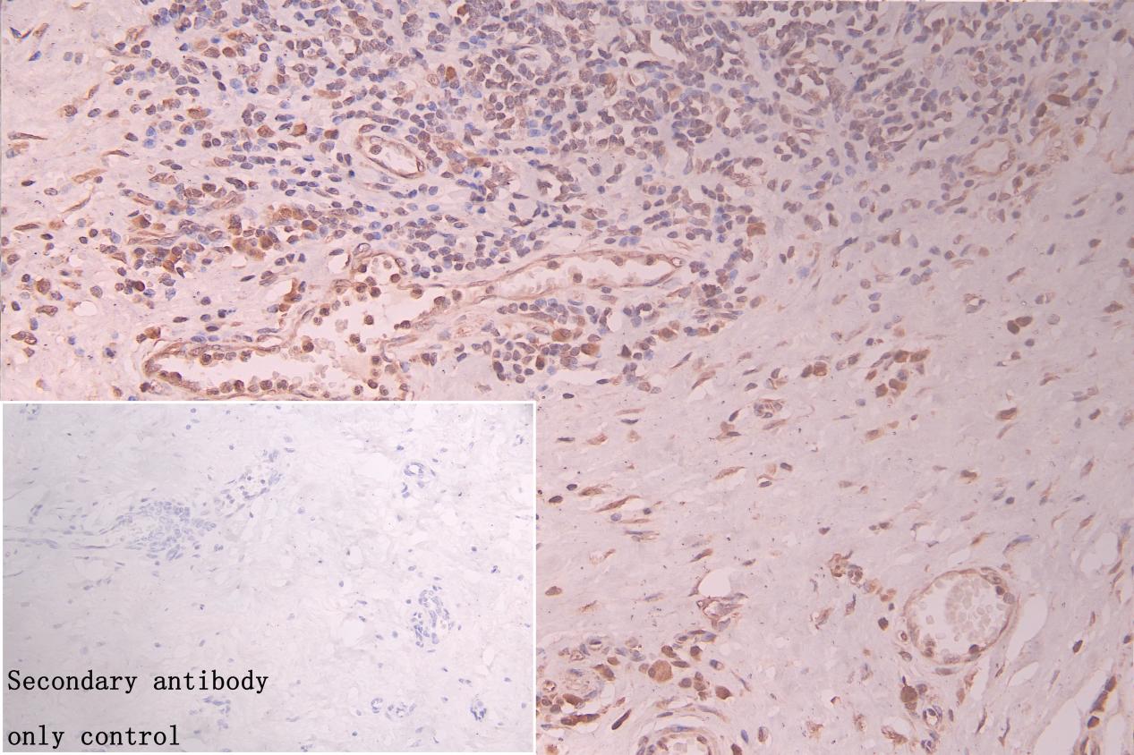 IHC image of CSB-PA618777ESR1HU diluted at 1:120 and staining in paraffin-embedded human gastric cancer performed on a Leica BondTM system. After dewaxing and hydration, antigen retrieval was mediated by high pressure in a citrate buffer (pH 6.0). Section was blocked with 10% normal goat serum 30min at RT. Then primary antibody (1% BSA) was incubated at 4°C overnight. The primary is detected by a Goat anti-rabbit polymer IgG labeled by HRP and visualized using 0.05% DAB. Secondary antibody only control: uses 1% BSA instead of primary antibody