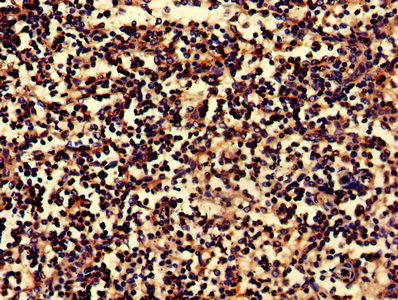 IHC image of CSB-PA840984LA01HU diluted at 1:800 and staining in paraffin-embedded human spleen tissue performed on a Leica BondTM system. After dewaxing and hydration, antigen retrieval was mediated by high pressure in a citrate buffer (pH 6.0). Section was blocked with 10% normal goat serum 30min at RT. Then primary antibody (1% BSA) was incubated at 4°C overnight. The primary is detected by a biotinylated secondary antibody and visualized using an HRP conjugated SP system.