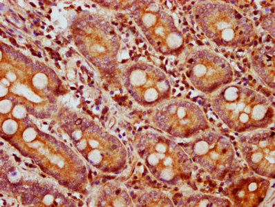 IHC image of CSB-PA09419A0Rb diluted at 1:750 and staining in paraffin-embedded human small intestine tissue performed on a Leica BondTM system. After dewaxing and hydration, antigen retrieval was mediated by high pressure in a citrate buffer (pH 6.0). Section was blocked with 10% normal goat serum 30min at RT. Then primary antibody (1% BSA) was incubated at 4°C overnight. The primary is detected by a biotinylated secondary antibody and visualized using an HRP conjugated SP system.