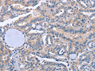 The image on the left is immunohistochemistry of paraffin-embedded Human thyroid cancer tissue using CSB-PA554403(BOD1 Antibody) at dilution 1/60, on the right is treated with synthetic peptide. (Original magnification: ×200)