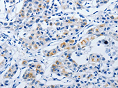 The image on the left is immunohistochemistry of paraffin-embedded Human lung cancer tissue using CSB-PA578519(BPIFB3 Antibody) at dilution 1/50, on the right is treated with synthetic peptide. (Original magnification: ×200)