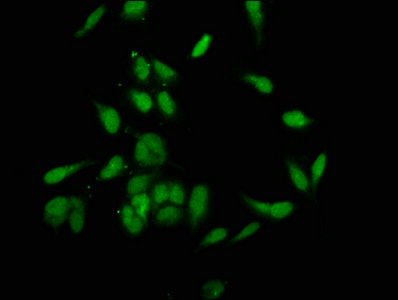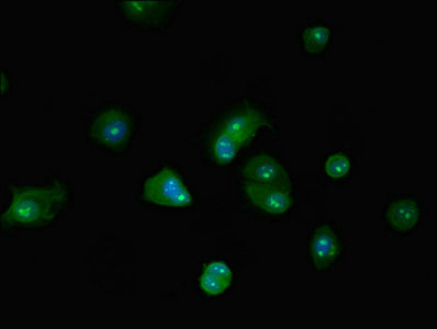 Immunofluorescence staining of Hela cells with CSB-PA002802LA01HU at 1:200, counter-stained with DAPI. The cells were fixed in 4% formaldehyde, permeabilized using 0.2% Triton X-100 and blocked in 10% normal Goat Serum. The cells were then incubated with the antibody overnight at 4°C. The secondary antibody was Alexa Fluor 488-congugated AffiniPure Goat Anti-Rabbit IgG(H+L).