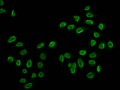 Immunofluorescence staining of Hela cells (treated with 30mM sodium butyrate for 4h) with CSB-PA010403OA20butHU at 1:15, counter-stained with DAPI. The cells were fixed in 4% formaldehyde, permeabilized using 0.2% Triton X-100 and blocked in 10% normal Goat Serum. The cells were then incubated with the antibody overnight at 4°C. The secondary antibody was Alexa Fluor 488-congugated AffiniPure Goat Anti-Rabbit IgG(H+L).