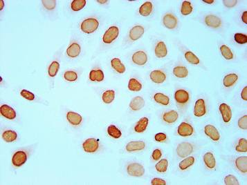 Immunocytochemistry analysis of CSB-PA010429OA08butHU diluted at 1:75 and staining in Hela cells (treated with 30mM sodium butyrate for 4h) performed on a Leica BondTM system. The cells were fixed in 4% formaldehyde, permeabilized using 0.2% Triton X-100 and blocked with 10% normal goat serum 30min at RT. Then primary antibody (1% BSA) was incubated at 4°C overnight. The primary is detected by a biotinylated secondary antibody and visualized using an HRP conjugated SP system.