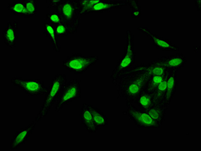 Immunofluorescence staining of Hela cells with CSB-PA03474A0Rb at 1:533, counter-stained with DAPI. The cells were fixed in 4% formaldehyde, permeabilized using 0.2% Triton X-100 and blocked in 10% normal Goat Serum. The cells were then incubated with the antibody overnight at 4°C. The secondary antibody was Alexa Fluor 488-congugated AffiniPure Goat Anti-Rabbit IgG(H+L).
