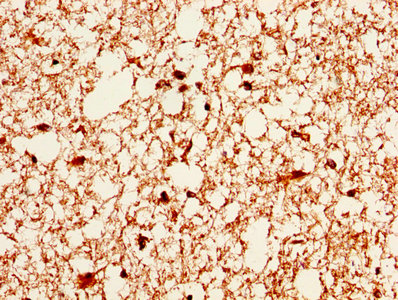 IHC image of CSB-PA004370HA01HU diluted at 1:400 and staining in paraffin-embedded human brain tissue performed on a Leica BondTM system. After dewaxing and hydration, antigen retrieval was mediated by high pressure in a citrate buffer (pH 6.0). Section was blocked with 10% normal goat serum 30min at RT. Then primary antibody (1% BSA) was incubated at 4°C overnight. The primary is detected by a biotinylated secondary antibody and visualized using an HRP conjugated SP system.