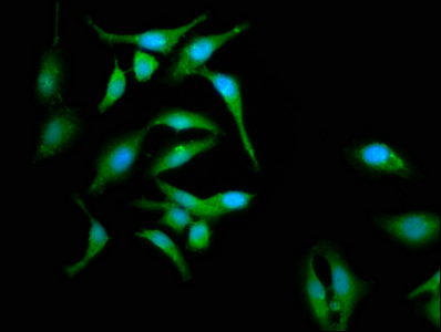 Immunofluorescence staining of Hela cells with CSB-PA004390LA01HU at 1:133, counter-stained with DAPI. The cells were fixed in 4% formaldehyde, permeabilized using 0.2% Triton X-100 and blocked in 10% normal Goat Serum. The cells were then incubated with the antibody overnight at 4°C. The secondary antibody was Alexa Fluor 488-congugated AffiniPure Goat Anti-Rabbit IgG(H+L).
