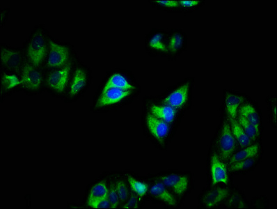 Immunofluorescence staining of Hela cells with CSB-PA004407LA01HU at 1:200, counter-stained with DAPI. The cells were fixed in 4% formaldehyde, permeabilized using 0.2% Triton X-100 and blocked in 10% normal Goat Serum. The cells were then incubated with the antibody overnight at 4°C. The secondary antibody was Alexa Fluor 488-congugated AffiniPure Goat Anti-Rabbit IgG(H+L).