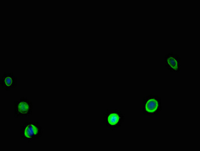 Immunofluorescent analysis of MCF-7 cells using CSB-PA004458YA01HU at dilution of 1:100 and Alexa Fluor 488-congugated AffiniPure Goat Anti-Rabbit IgG(H+L)