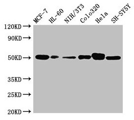 Positive WB detected in: MCF-7 whole cell lysate, HL60 whole cell lysate, NIH/3T3 whole cell lysate, Colo320 whole cell lysate, Hela whole cell lysate, SH-SY5Y whole cell lysate