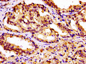 IHC image of CSB-PA822299LA01HU diluted at 1:100 and staining in paraffin-embedded human prostate cancer performed on a Leica BondTM system. After dewaxing and hydration, antigen retrieval was mediated by high pressure in a citrate buffer (pH 6.0). Section was blocked with 10% normal goat serum 30min at RT. Then primary antibody (1% BSA) was incubated at 4°C overnight. The primary is detected by a biotinylated secondary antibody and visualized using an HRP conjugated SP system.