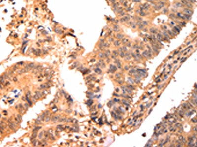 The image on the left is immunohistochemistry of paraffin-embedded Human colon cancer tissue using CSB-PA921513(CAPNS1 Antibody) at dilution 1/15, on the right is treated with fusion protein. (Original magnification: ×200)