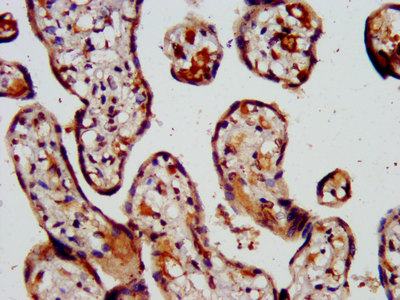 IHC image of CSB-PA861167LA01HU diluted at 1:500 and staining in paraffin-embedded human placenta tissue performed on a Leica BondTM system. After dewaxing and hydration, antigen retrieval was mediated by high pressure in a citrate buffer (pH 6.0). Section was blocked with 10% normal goat serum 30min at RT. Then primary antibody (1% BSA) was incubated at 4°C overnight. The primary is detected by a biotinylated secondary antibody and visualized using an HRP conjugated SP system.
