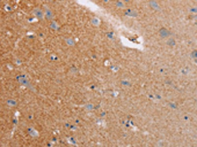The image on the left is immunohistochemistry of paraffin-embedded Human brain tissue using CSB-PA590757(CASC3 Antibody) at dilution 1/20, on the right is treated with fusion protein. (Original magnification: ×200)