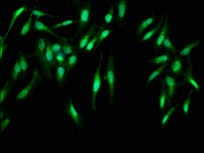 Immunofluorescence staining of Hela cells with CSB-PA004547LA01HU at 1:400, counter-stained with DAPI. The cells were fixed in 4% formaldehyde, permeabilized using 0.2% Triton X-100 and blocked in 10% normal Goat Serum. The cells were then incubated with the antibody overnight at 4°C. The secondary antibody was Alexa Fluor 488-congugated AffiniPure Goat Anti-Rabbit IgG(H+L).