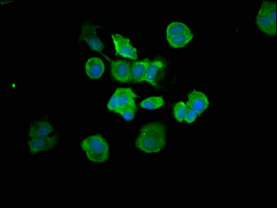Immunofluorescence staining of MCF-7 cells with CSB-PA15479A0Rb at 1:66, counter-stained with DAPI. The cells were fixed in 4% formaldehyde, permeabilized using 0.2% Triton X-100 and blocked in 10% normal Goat Serum. The cells were then incubated with the antibody overnight at 4°C. The secondary antibody was Alexa Fluor 488-congugated AffiniPure Goat Anti-Rabbit IgG(H+L).