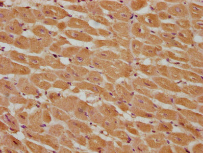 IHC image of CSB-PA004555LA01HU diluted at 1:285 and staining in paraffin-embedded human heart tissue performed on a Leica BondTM system. After dewaxing and hydration, antigen retrieval was mediated by high pressure in a citrate buffer (pH 6.0). Section was blocked with 10% normal goat serum 30min at RT. Then primary antibody (1% BSA) was incubated at 4°C overnight. The primary is detected by a biotinylated secondary antibody and visualized using an HRP conjugated SP system.