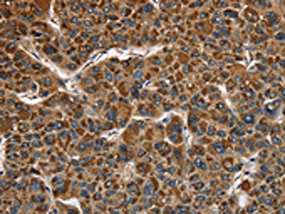The image on the left is immunohistochemistry of paraffin-embedded Human liver cancer tissue using CSB-PA599838(CAT Antibody) at dilution 1/40, on the right is treated with fusion protein. (Original magnification: ×200)