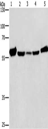 Gel: 8%SDS-PAGE, Lysate: 40 μg, Lane 1-5: Mouse liver tissue, Raji cells, hela cells, hepG2 cells, A549 cells, Primary antibody: CSB-PA599838(CAT Antibody) at dilution 1/266.6, Secondary antibody: Goat anti rabbit IgG at 1/8000 dilution, Exposure time: 20 seconds