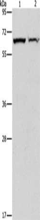Gel: 8%SDS-PAGE, Lysate: 40 μg, Lane 1-2: Mouse pancreas tissue, human fetal liver tissue, Primary antibody: CSB-PA205503(CBS Antibody) at dilution 1/550, Secondary antibody: Goat anti rabbit IgG at 1/8000 dilution, Exposure time: 3 seconds