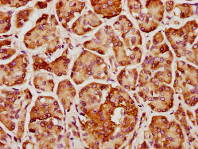 IHC image of CSB-PA744397LA01HU diluted at 1:400 and staining in paraffin-embedded human pancreatic cancer performed on a Leica BondTM system. After dewaxing and hydration, antigen retrieval was mediated by high pressure in a citrate buffer (pH 6.0). Section was blocked with 10% normal goat serum 30min at RT. Then primary antibody (1% BSA) was incubated at 4°C overnight. The primary is detected by a biotinylated secondary antibody and visualized using an HRP conjugated SP system.