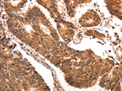 The image is immunohistochemistry of paraffin-embedded human colon cancer tissue using CSB-PA113746(CCL17 Antibody) at dilution 1/70. (Original magnification: ×200)