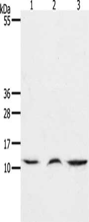 Gel: 15%SDS-PAGE, Lysate: 40 μg, Lane 1-3: Mouse lung tissue, Mouse thymus tissue, human fetal muscle tissue, Primary antibody: CSB-PA113746(CCL17 Antibody) at dilution 1/1300, Secondary antibody: Goat anti rabbit IgG at 1/8000 dilution, Exposure time: 45 seconds