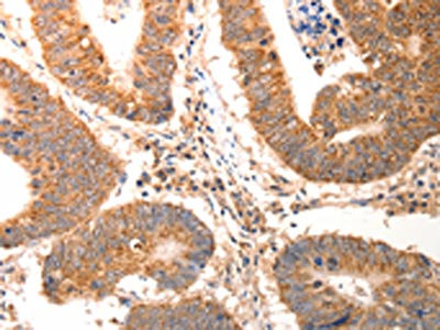 The image on the left is immunohistochemistry of paraffin-embedded Human colon cancer tissue using CSB-PA174494(CCL17 Antibody) at dilution 1/60, on the right is treated with synthetic peptide. (Original magnification: ×200)