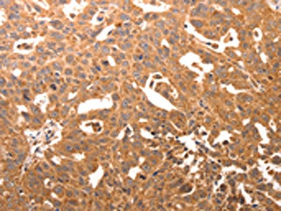 The image on the left is immunohistochemistry of paraffin-embedded Human ovarian cancer tissue using CSB-PA174494(CCL17 Antibody) at dilution 1/60, on the right is treated with synthetic peptide. (Original magnification: ×200)