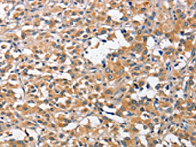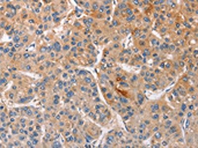 The image on the left is immunohistochemistry of paraffin-embedded Human liver cancer tissue using CSB-PA193639(CCL4 Antibody) at dilution 1/40, on the right is treated with fusion protein. (Original magnification: ×200)