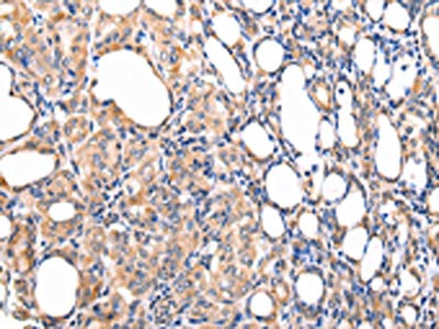 The image on the left is immunohistochemistry of paraffin-embedded Human thyroid cancer tissue using CSB-PA082817(CCL7 Antibody) at dilution 1/20, on the right is treated with synthetic peptide. (Original magnification: ×200)