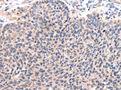 The image on the left is immunohistochemistry of paraffin-embedded Human lung cancer tissue using CSB-PA082817(CCL7 Antibody) at dilution 1/20, on the right is treated with synthetic peptide. (Original magnification: ×200)