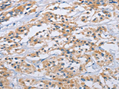 The image on the left is immunohistochemistry of paraffin-embedded Human thyroid cancer tissue using CSB-PA293047(CCR9 Antibody) at dilution 1/40, on the right is treated with fusion protein. (Original magnification: ×200)