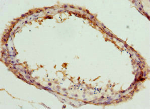 Immunohistochemistry of paraffin-embedded human testis tissue using CSB-PA004862ESR2HU at dilution of 1:100