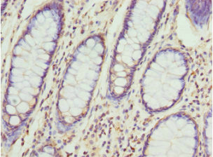 Immunohistochemistry of paraffin-embedded human colon cancer using CSB-PA004862ESR2HU at dilution of 1:100