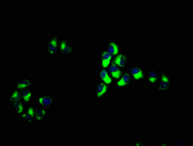 Immunofluorescence staining of Hela cells with CSB-PA801238LA01HU at 1:66, counter-stained with DAPI. The cells were fixed in 4% formaldehyde, permeabilized using 0.2% Triton X-100 and blocked in 10% normal Goat Serum. The cells were then incubated with the antibody overnight at 4°C. The secondary antibody was Alexa Fluor 488-congugated AffiniPure Goat Anti-Rabbit IgG(H+L).