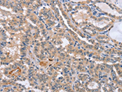 The image on the left is immunohistochemistry of paraffin-embedded Human thyroid cancer tissue using CSB-PA569109(CD36 Antibody) at dilution 1/60, on the right is treated with synthetic peptide. (Original magnification: ×200)