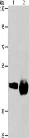 Gel: 6%SDS-PAGE, Lysate: 40 μg, Lane 1-2: A549 cells, Raji cells, Primary antibody: CSB-PA926996(CD38 Antibody) at dilution 1/520, Secondary antibody: Goat anti rabbit IgG at 1/8000 dilution, Exposure time: 3 minutes